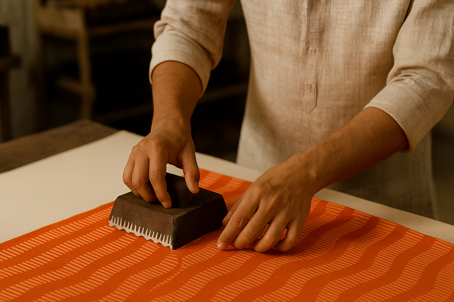 Our Silk: Hand Block Printed, One Block at a TimeWe begin with wooden blocks that are carved by hand, sometimes over several days. Each block is a signature: a blend of heritage motifs and our modern design sensibility. We work with natural vegetable dyes — colours drawn from roots, flowers, and minerals — and print each motif by hand, step by step: